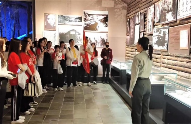 唱红色经典,抒爱国之情。在沿途中,讲解员为大家开展了情景教学,带来了一堂“行走的主题团课”。讲解员向大家讲述了神秘抗联交通站的故事,情景再现了抗联战士艰苦的战斗生活。全体人员齐声高唱红色歌曲《第一路军军歌》《歌唱祖国》,嘹亮的歌声传遍山林、涤荡心灵,激发了团员青年们的壮志豪情,坚定了师生传承红色基因,感党恩、跟党走的坚定信念。