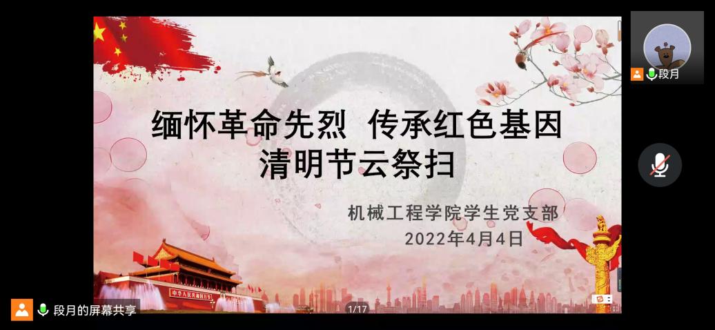 清明,承载了无数思念和悲欢;而扫墓,既是对先人的礼敬,更是对自己心灵的安抚。为引导机械工程学院学生支部党员慎终追远、缅怀英烈、铭记历史、学会感恩,自觉做弘扬爱国主义的时代先锋,机械工程学院于4月4日上午10点开展线上云祭扫活动。本次活动由段月同学主持,支部全体党员参加。