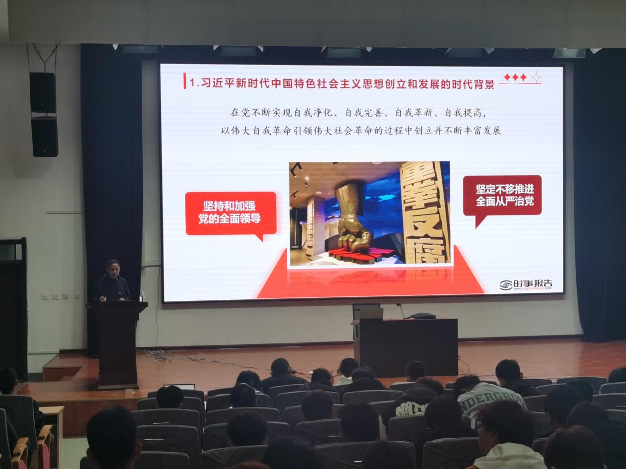 为进一步使学生充分认识到习近平新时代中国特色社会主义思想实现了马克思主义中国化时代化新的飞跃,增进政治认同、思想认同、理论认同、情感认同,争当新思想、新理论的坚定信仰者、忠实实践者,资源与土木工程学院院长邢文战、党总支书记吴绪子分别于11月8日和10月23日为学院2020级、2021级学生讲授形势与政策课。